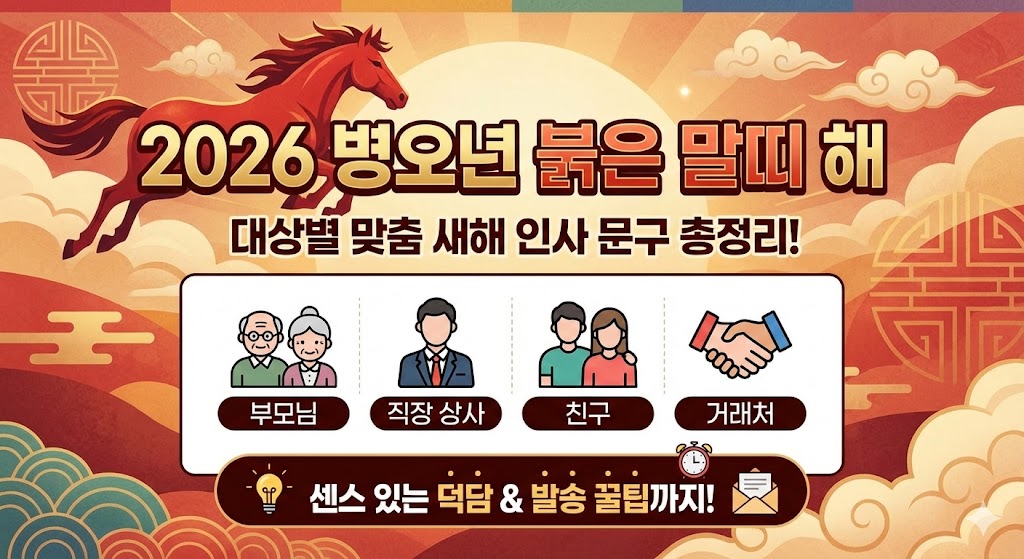 2026년, 열정이 가득한 붉은 말의 해인 병오년이 드디어 밝았습니다. 소중한 지인들에게 어떤 말로 마음을 전해야 할지 고민하는 분들이 많으실 텐데요, 오늘은 상황과 대상에 딱 맞는 센스 있는 2026년 새해인사 문구를 다양하게 준비해 봤습니다. 이 글을 참고해서 따뜻한 마음을 나누고 행복한 한 해를 시작해 보세요.