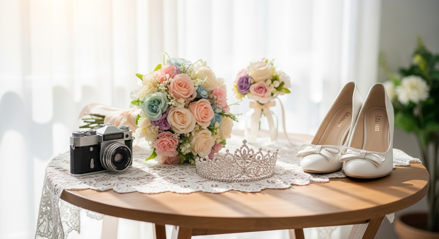 남들과 똑같은 사진이 싫다면, 두 사람만의 추억이 깃든 물건을 챙겨보세요. 가장 대표적인 것이 바로 웨딩 밴드(반지)와 웨딩 슈즈예요. 반지를 끼워주는 손 클로즈업 샷이나, 슈즈를 신겨주는 신데렐라 샷은 웨딩 앨범의 필수 코스죠. 이런 웨딩촬영 소품은 유행을 타지 않고 시간이 지나서 봐도 촌스럽지 않다는 장점이 있어요.